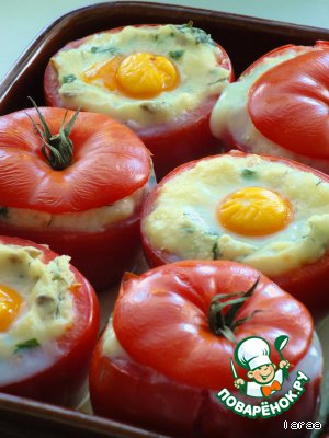 У 6 шт помидор(крупных) срезать крышечку и вырезать мякоть с семенами. Нафаршировать помидоры начинкой и сделать ложкой не большое углубление в середине. Туда разбить по 1 яйцу. Положить в форму для духовки и выпекать примерно мин.30. при 180-200°C. Мой муж любит , что бы желток еше немного растекался, поэтому его помидоры я закрыла крышечкой.