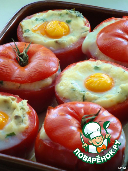 У 6 шт помидор(крупных) срезать крышечку и вырезать мякоть с семенами. Нафаршировать помидоры начинкой и сделать ложкой не большое углубление в середине. Туда разбить по 1 яйцу. Положить в форму для духовки и выпекать примерно мин.30. при 180-200°C. Мой муж любит , что бы желток еше немного растекался, поэтому его помидоры я закрыла крышечкой.