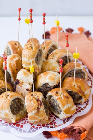 Sausage Rolls или сосиска в тесте?! Это мой рецепт, по сути - котлета в слоеном тесте. Готовила накануне, перед подачей разогрела в микро. Лучше всего брать нежирную свинину, из говядины может получиться суховато.