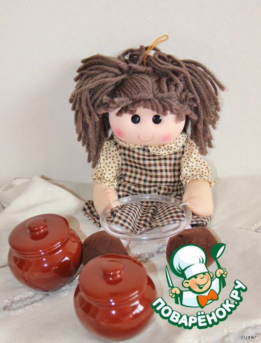 А вот подарочек, который она мне подарила. Кукла-держалка для кухонного полотенца, Маруся, и очаровательные горшочки для запекания. Были еще конфеты, но сейчас они уже надежно и навсегда спрятанны в животиках у моих детишек.
