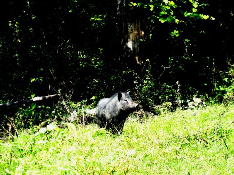 Дружок помчался знакомиться с ним , я растерялась , испугалась за Дружка и не сразу сообразила ,что надо же сфотографировать сие явление,пока наводила резкость -кабанчик убежал.Снимок вышел не очень ,было очень яркое солнце.