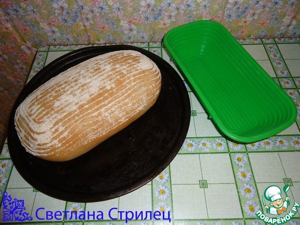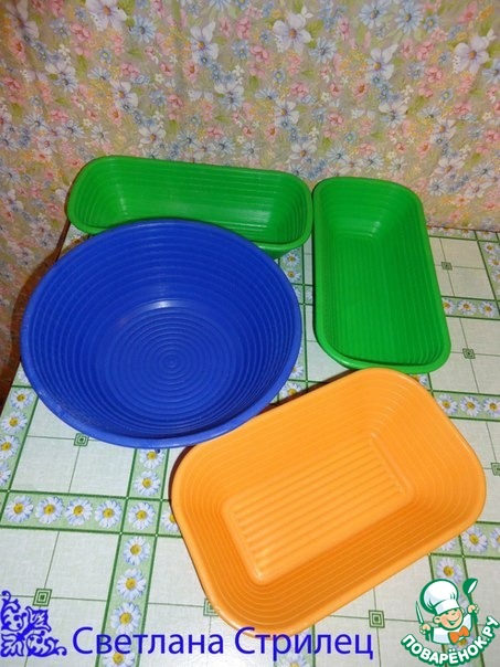 Вот такие немецкие формы для расстойки хлеба я приобрела, печь в них нельзя. Их посыпают мукой (пшеничной или ржаной), укладывают готовое тесто, дают ему подняться. Затем я кладу сверху смазанный маслом противень, аккуратно переворачиваю форму с подошедшим тестом. [cut]