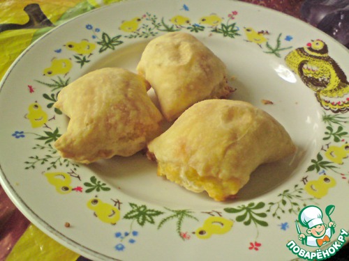 А третью порцию сделала с сыром и чесноком.Только я тонко тесто раскатала ,и сыр немного потёк.Получились с интересным вкусом.Тесто нарезала на пластины ,на каждую клала тертый сыр и чеснок,и заворачивала.Вот примерно так выглядит это в готовом виде.