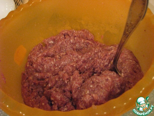 Мясо с луком промолототь через мясорубку дважды. Посолить, добавить смесь перцев и влить 1/3 стакана ледяной!!!! воды. Именно вода придасть сочность начинке.