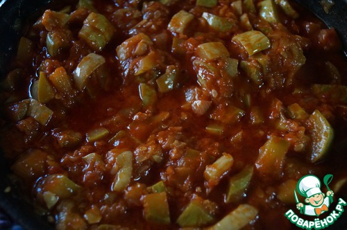 3. Добавляю в сковороду нарезанные кабачки, чуть воды и тушу под закрытой крышкой до готовности кабачков.