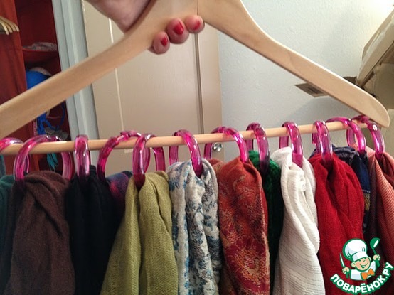 То тут самый лучший и простой способ разместить Вашу коллекцию шарфов на обычную вешалку для одежды повесить кольца от шторки для душа и разместить там шарфики.