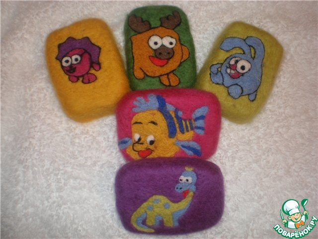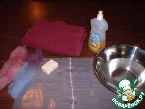 Для начала подготовим необходимые материалы - кусочек мыла, шерсть, непромокаемый коврик для валяния, полотенце и миску с горячей водой