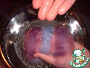 Теперь начинаем осторожно смачивать получившуюся заготовку горячей водой. Не стоит торопиться и опускать ее в воду целиком, так как мыло может выскользнуть из шерстяного кокона и работа будет испорчена