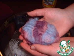 Когда шерсть окончательно промокнет начинаем мягко прижимать ее к мылу, периодически смачивая небольшим количеством воды
