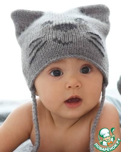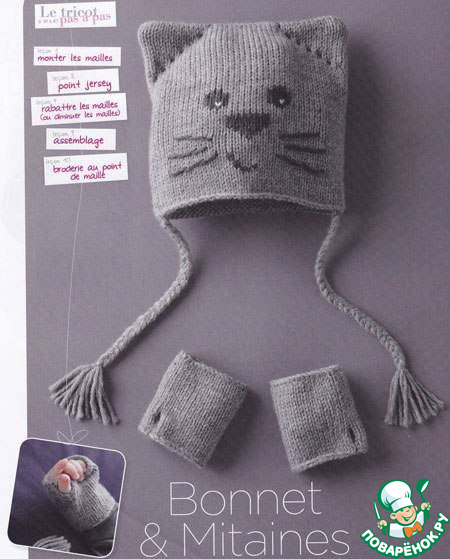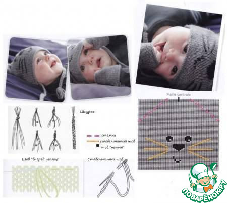На передней стороне шапочки вышиваем мордочку котика петельным швом, усы вышиваем стебельчатым швом. Сшиваем обе части шапочки и верх. Вышиваем ушки швом "вперед иголка" прокалывая обе части шапочки. Теперь остается сплести две косички длиной 20 см( я решила просто сплести шнур такой длины). пришиваем по бокам шапочки - это наши завязочки.