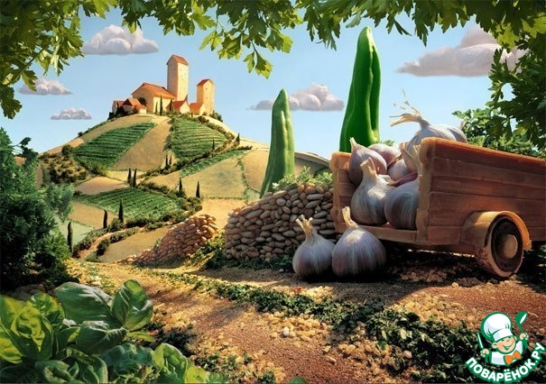 Создание одного съедобного пейзажа занимает несколько дней. Сначала по эскизам подбираются продукты. Затем два-три дня уходит на построение пейзажа и фотографирование, при этом, чтобы “капризная” еда под светом сафитов не заветривалась и не портилась, каждая сцена фотографируется слоями. Еще несколько дней уходит на ретушь и совмещение всех слоев и элементов фотографии. В результате получается великолепная иллюзия. [cut]