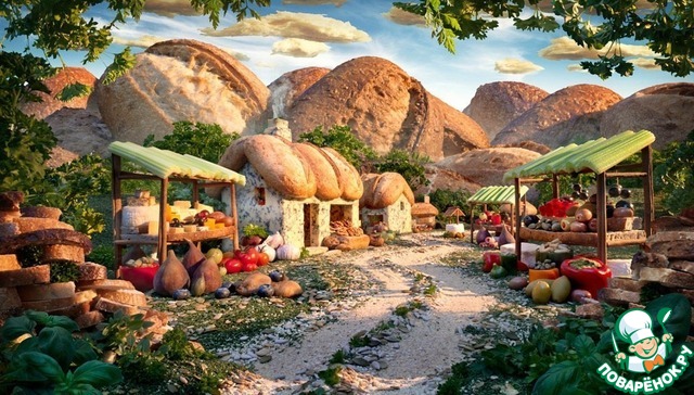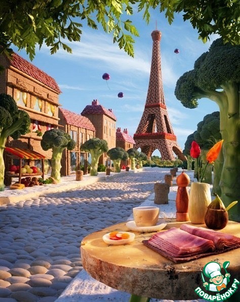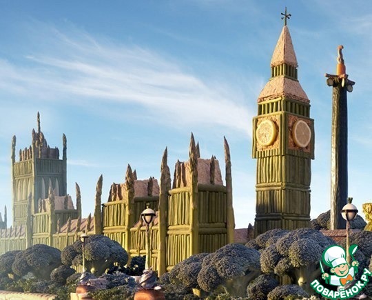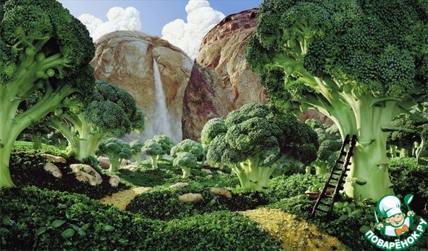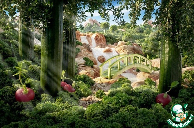 Создание одного съедобного пейзажа занимает несколько дней. Сначала по эскизам подбираются продукты. Затем два-три дня уходит на построение пейзажа и фотографирование, при этом, чтобы “капризная” еда под светом сафитов не заветривалась и не портилась, каждая сцена фотографируется слоями. Еще несколько дней уходит на ретушь и совмещение всех слоев и элементов фотографии. В результате получается великолепная иллюзия. [cut]