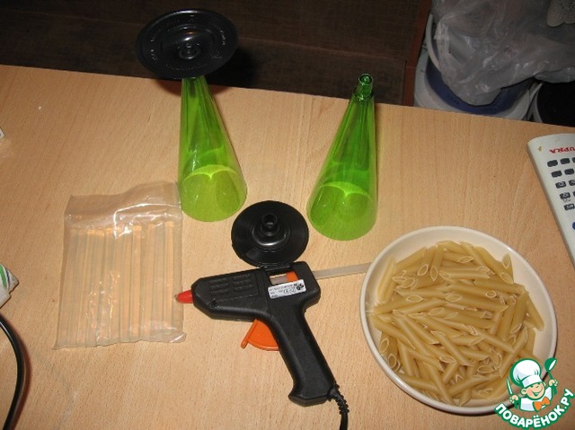 И так, приступим! Нам понадобятся 2 пластиковых фужера, точнее один фужер и 2 ножки от фужеров, из них мы в дальнейшем будем делать ножку елочки, также понадобится пистолет с горячим клеем, конечно же макароны "перья" у меня ушло примерно пол пачки) и в дальнейшем краска из баллончика. У меня елочка золотого цвета, Вы же можете покрасить и в серебряный цвет и в зеленый... В обще что душе угодно...