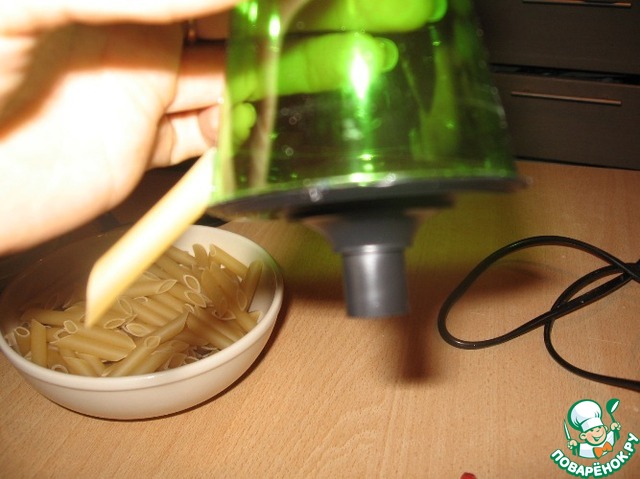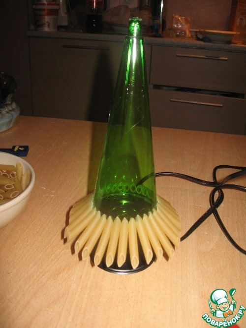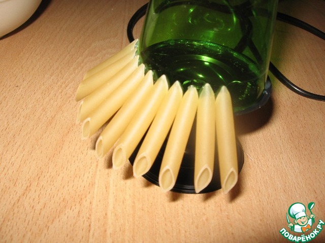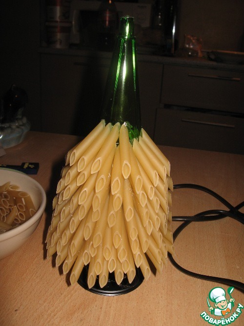И начинаем по кругу обклеивать наш корпус макаронами. Плотно прикладывая их друг к другу.
