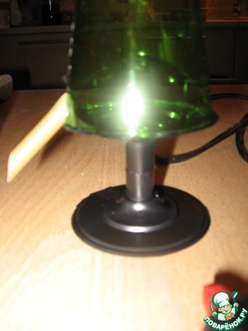 Первым делом приклеиваем горячим клеем к основанию нашего каркаса для елочки (фужера) ножку вот таким вот образом, как показано на фото.