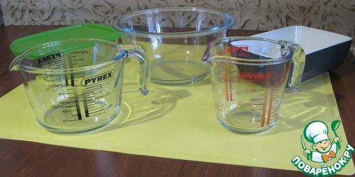 Далее посудка от фирмы «Pyrex». Я очень долго искала стеклянный мерный кувшин, чтоб можно было отмерять и греть молоко в микроволновке - в магазинах сплошь пластмасса одна продается. Вот мама из родного города по заказу привезла, тоже поискать пришлось. Потом уже в магазинах я присмотрелась к другой продукции этой фирмы, и мне очень понравилось качество их изделий из стекла и керамики.