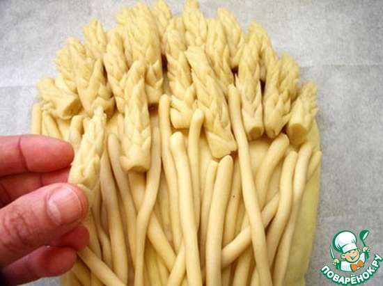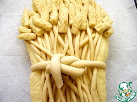 Затем часть теста раскатать в жгуты, другую часть теста вырезать в форме колосков.