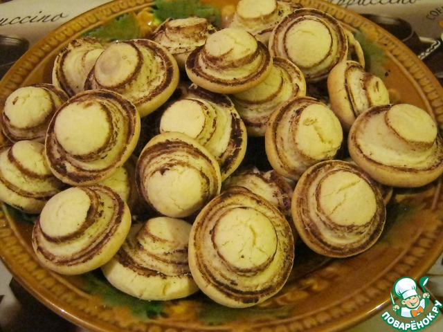Печенье "Шампиньоны" Подобные рецепты уже есть на сайте но мой от них отличается, предлагаю попробовать и сравнить . Надо - 150 гр масла или маргарина ,0,5 стакана сахара, 1 яйцо, какао 1 - 2 ст.л. 1,5 стакана картофельного крахмала ,0,5 ч.л соды( не гасить) , 0,5 стакана муки (+-). Приготовление - Масло растопить , остудить. Из всех ингредиентов кроме какао замешиваем тесто .Делаем шарики размером с грецкий орех . Шарики лучше сделать заранее чтоб они были одинаковой формы . Я делаю так . Противень застилаю пекарской бумагой ( ни чем её не смазываю !) Скатываю шарики и укладываю на противень , когда противень заполнен , беру пластиковую бутылку - окунаю горлышко в какао беру шарик из теста и вдавливаю его немного на горлышко , проворачиваю . В итоге у меня получается вот такой шампиньоник , возвращаю его на противень и так один за другим каждый шарик . Оставляйте немного места между вашими грибочками . Готовый к запеканию грибочки ничем смазывать не надо ! Запекаем в разогретой до 180 градусов духовке . 15- 20 минут . Печенье не должно зарумянится .Приятного аппетита