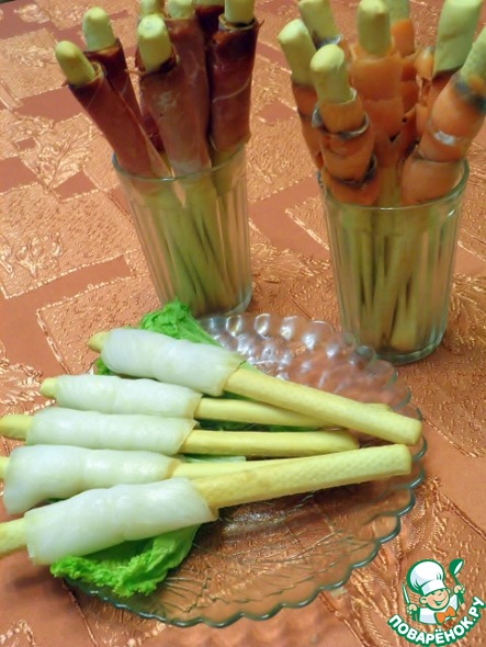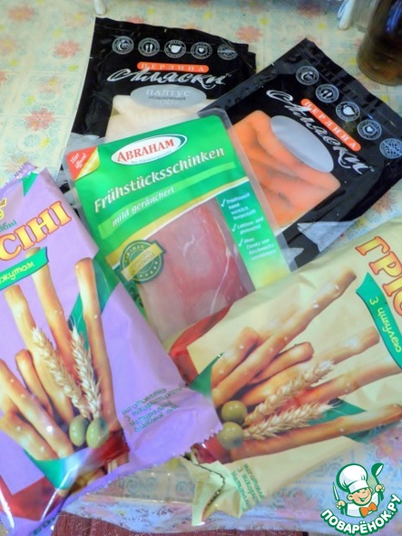 Первая закуска называется "Волшебные палочки". Для их приготовления нам потребуются 2 упаковки соленой соломки или тонких хлебных палочек, мясная и рыбная нарезки. У меня ветчина, форель и палтус. [cut]