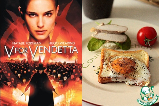 Впервые этот популярный в Америке рецепт приготовления яичницы был показан в кино в далёком 1941 году в фильме «Луна над Майами». Но современные зрители могли видеть его в стильном кинофильме от братьев Вачовски, тех самых, которые сняли "Матрицу" – «V значит Вендетта». Именно это блюдо борец за свободу в маске под прозвищем «V» готовит героине Натали Портман.