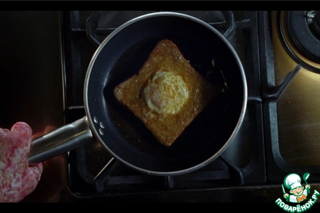 На сковороде растопите сливочное масло, в тостовом хлебе сделайте кружки и обжарьте все на сковородке. Здесь есть маленькая хитрость - чем меньше остается хлеба, тем вкуснее получается яичница!)