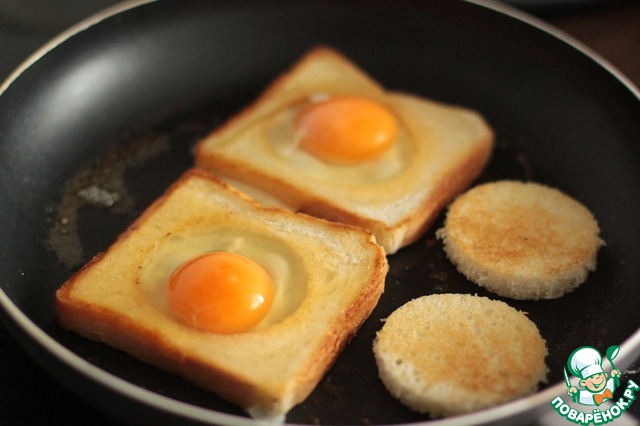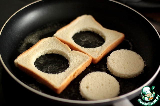 На сковороде растопите сливочное масло, в тостовом хлебе сделайте кружки и обжарьте все на сковородке. Здесь есть маленькая хитрость - чем меньше остается хлеба, тем вкуснее получается яичница!)