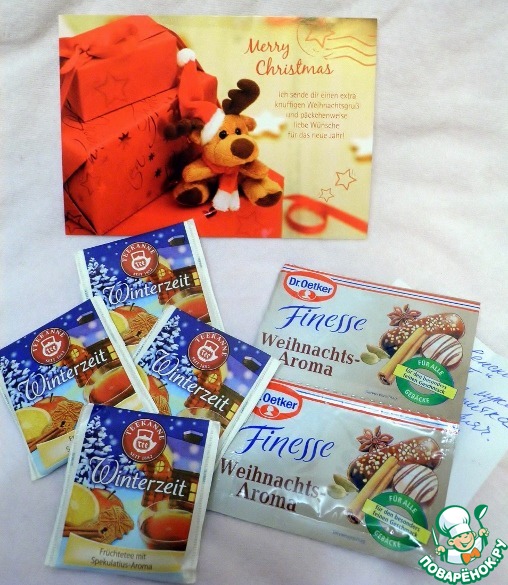 И самая ароматная часть подарка: рождественский чай и пакетики приправы для глинтвейна, горячего шоколада и т.д "рождественский аромат". Именно они подарили такой аромат рождества, что просто нет слов, когда посылку только начала открывать и поплыл аромат поняла, что я просто в нирване, хотелось просто сидеть и нюхать, нюхать.