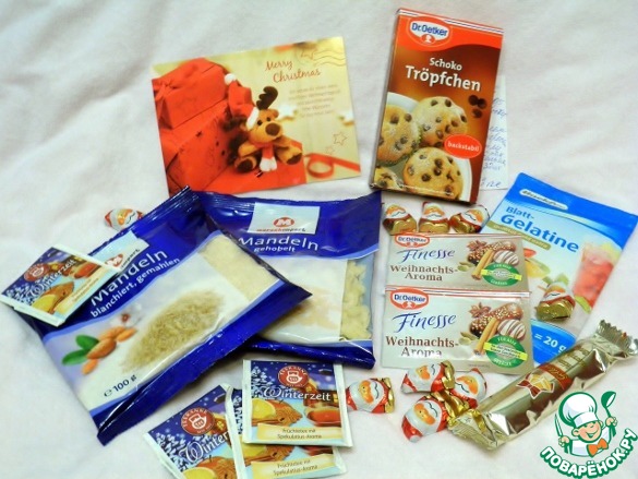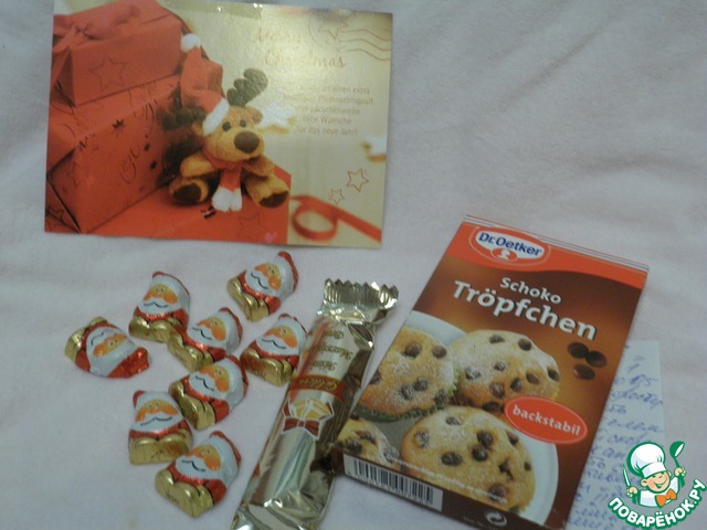 Самая сладкая часть - это россыпь шоколадных дедв морозиков. Они, кстати были припрятаны до сегодняшнего утра, а потом благополучно засунуты под подушку детям в качестве подарка от Николая. Ниночка, ты стала Св. Николаем для моих детишек! Шоколадная же конфета с марципановой начинкой - прожила недолго, разделили по-братски с мужем еще вчера и , наконец, упаковка шоколадных капель. У нас таких не видела. Кроме того, спасибо огромное за внимательность, ко всем подаркам прикреплены записочки с переводом!