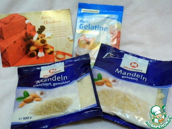 В бандерольки очень небольшого размера поместилось так много всего: пакетик с миндальной мукой-крошкой и пакетик с миндальными лепестками. Как Нина угадала, что миндаль мой любимый орех. И, ну это просто мечта идиота, то бишь моя мечта - листовой желатин. У нас его найти невозможно, а так хотелось попробовать, и вот он у меня есть, теперь буду подбирать рецепты под него