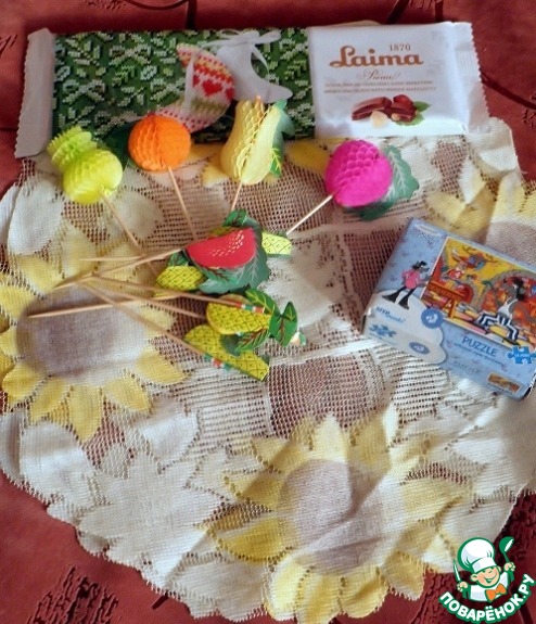 Две нежные салфетки, забавные штучки для праздничного стола, украшенные фруктами, бооольшая плитка шоколада с орехами (уже благополучно съедена) и пазлы для сынишки.