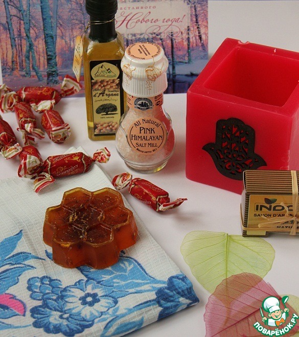 А еще через пару дней я получила посылочку от Ларисы. Настоящая кладезь подарков. Замечательный мароканский подсвечник с рукой Фатимы(защищает женщин от сглаза и болезней), два очень ароматных мыла (одно мароканское и другое сделаное ее доченькой), аргановое масло, гималайская розовая соль, полотенце, листики для осенних фотосессий, конфеты и душевная открытка.