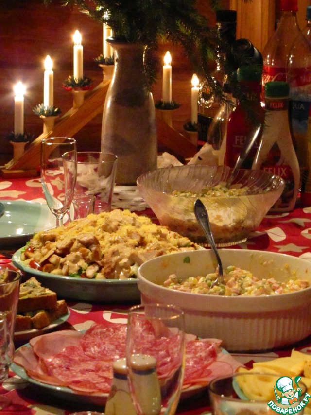 Новый год встречали с салатом Оливье(мужская половина настояла) и мандаринами -ну как же без них! В общем, русское застолье с финскими продуктами получилось))
