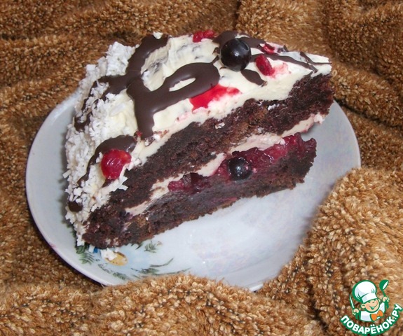 Разделила на 2 части, одну часть уложила на блюдо, придав форму, сверху смесь ягод и крем, накрыла 2-й частью бисквита и украсила.