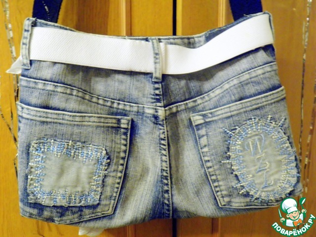 Итак, выбираем какие части джинсов пойдут в переделку. В моем случае это задняя часть с карманами и часть одной штанины. Вырезаем их и приводим в соответствие по размеру друг с другом. Сшиваем по широкой стороне - это будет дно сумки. В принципе можно сразу сшить и боковины, но я решила что моя сумка должна быть на подкладке, поэтому выкроила из рубашки подходящего размера кусок и сначала пришила его, а потом уж стачала бока сумки потайным швом (честно не помню точное название шва, суть: прострачиваем сначала с лицевой стороны, а затем выворачиваем и сшиваем с изнанки - кромка ткани оказывается внутри шва). В результате получился вот такой себе прямоуголный мешочек. Сверху я продела пояс - ремень, который шел в комплекте с какими-то из джинсов. Вот так сумочка стала выглядеть сзади.
