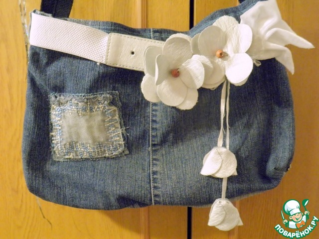 Декорировать такую сумочку можно по своему вкусу и усмотрению. Я просто еще на начальном этапе пришила кусочек ткани с рисунком, вырезанный из этих же джинсов.