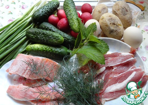 Гостям предлагаю два варианта окрошки на выбор : 1. мясная - с сырокопченой грудинкой; 2.рыбная – с копчёной горбушей.Окрошка была на Айране.