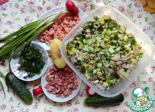 Эстеты спорят, как нужно нарезать овощи: мелко, чуть ли не в крошку, чтобы было оправдано название (от глагола крошить — мелко нарезать), или же допустимы вольности вроде кружочков редиски и огурца. Истина наверняка где-то посередине, так что лучше всего полагаться на собственный вкус.