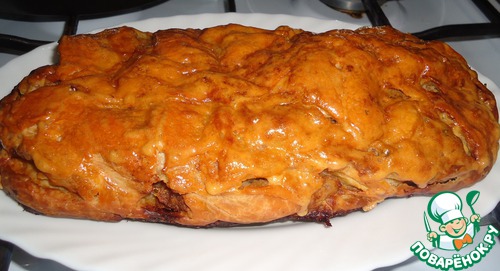Это пирог экспромт-мясной из ... чебурек. Да, да, Вы правильно прочитали, из ЧЕБУРЕК. А приготовление его произошло вот из-за чего. Все прекрасно помнят жаркое и душное лето 2010 года, а тут ещё как на зло отключили электричество в дневное время (как правило, все в это время на работе), холодильник практически разморозился, а в морозилке у меня лежали п/ф чебурек от свекрови. Назвать их чебуреками было уже сложно, это была масса из теста с мясом. Выкидывать жалко конечно было и я решила всё это дело запечь, сформировав такой овальный пирог и смазала яичным желтком. Вот что получилось в итоге.