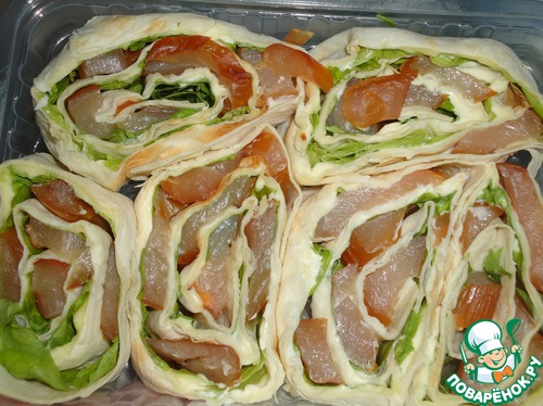 Рулеты из лаваша, конечно их огромное разнообразие, но в моей семье нравятся больше всего с копченой куриной грудкой, мягким сыром и листьями салата. Получаются ооочень сытные рулеты!