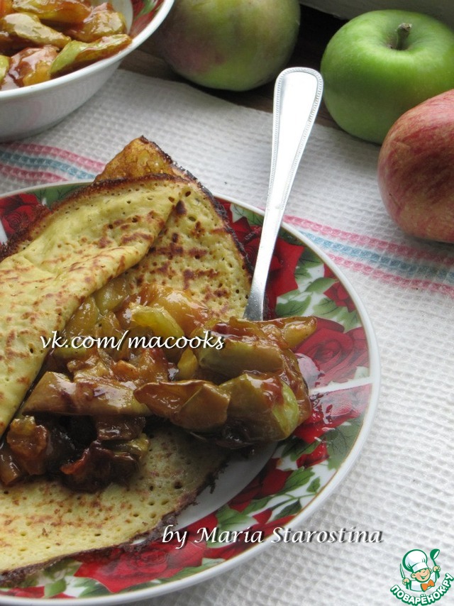 Когда смесь станет слегка коричневого цвета,добавляем яблоки и тушим все на небольшом огне пока яблоки не станут мягкими, затем приправляем ванилином и корицей.