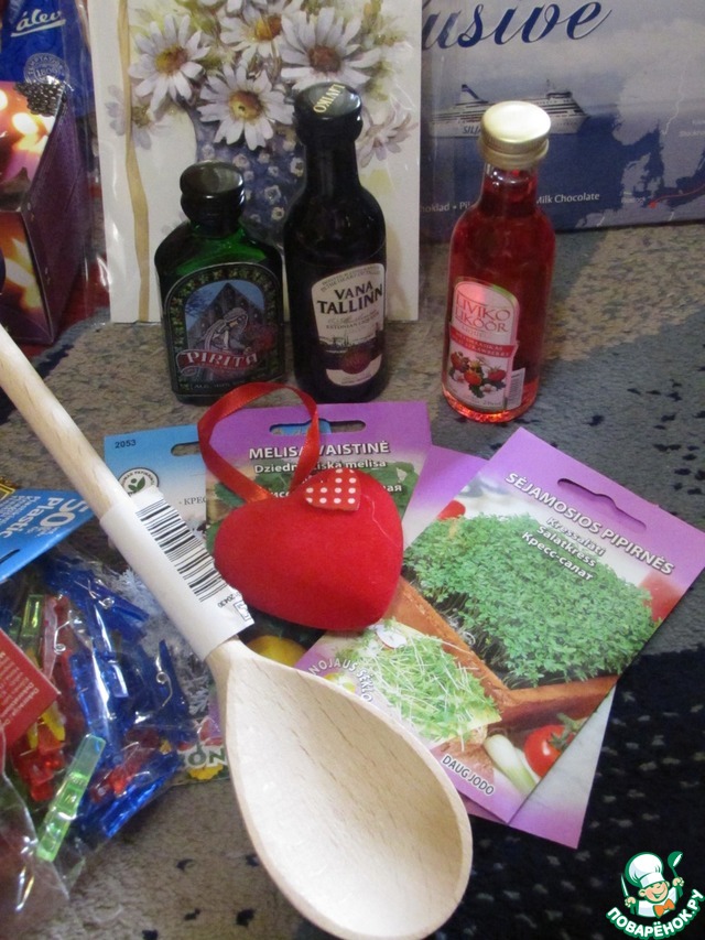 - Красивое керамическое блюдо, подставочки под чашки, ванилин, корица, ложка и лопаточка, пакет сушеных овощей -как же без этого всего на кухне!