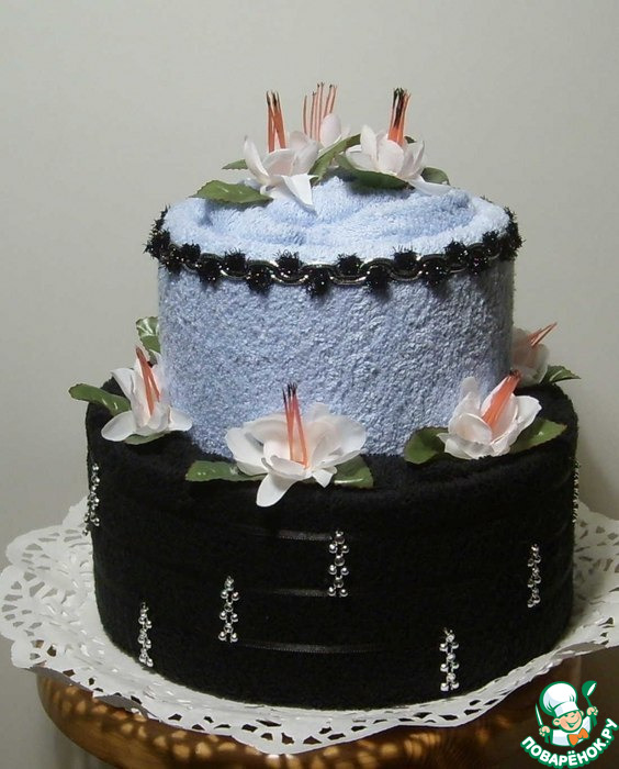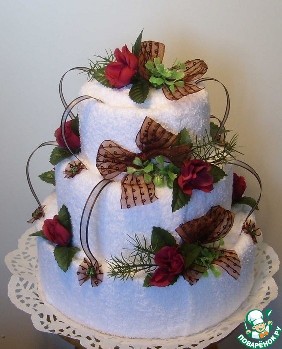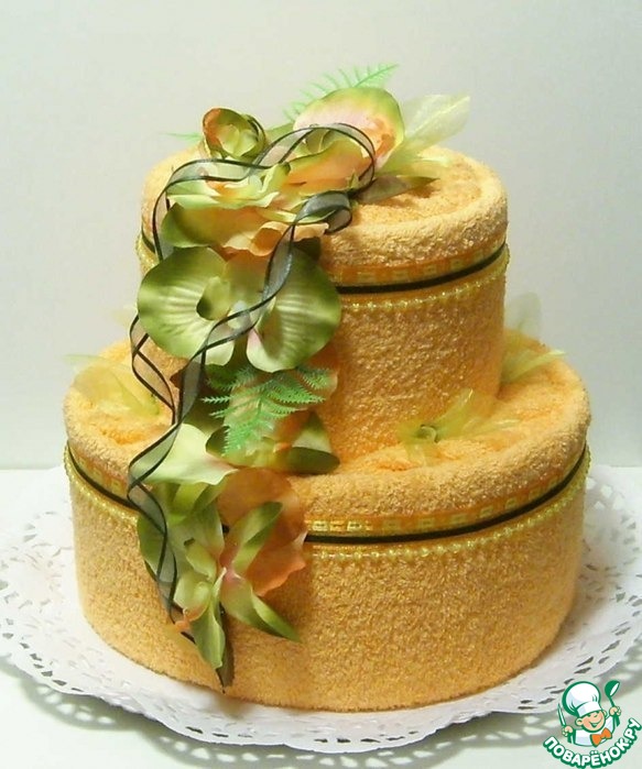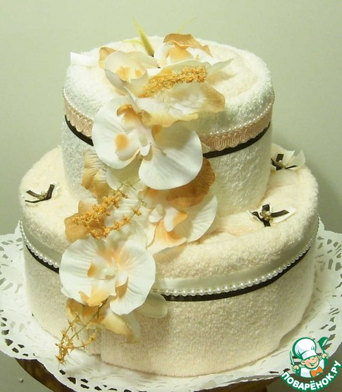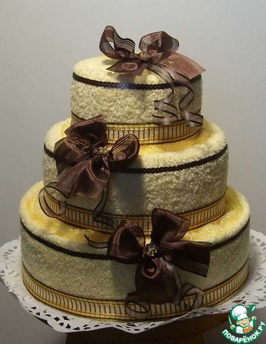 а тортики, я думаю, плотно скручены несколько полотенец, закреплены булавками и украшены бусами/лентами/цветами