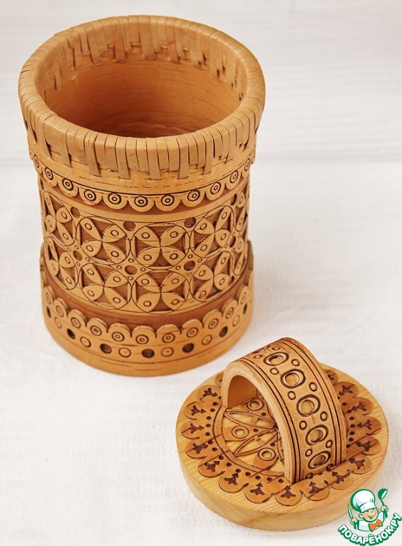 И последний, но зато какой ! Берестяной туесок, сделанный руками Ириного папы. Очень красивая, душевная работа! Буду бережно хранить его.