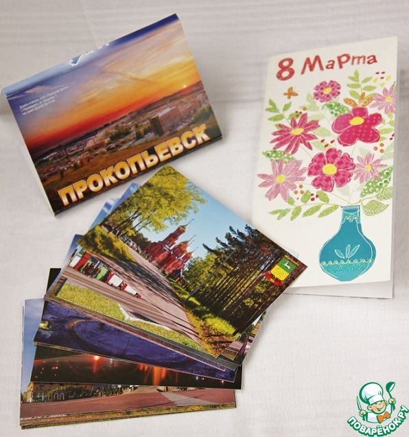 Открытки: одна поздравительная с теплыми словами и набор, с видами города, где живет Ира. Кстати, мой муж сразу же с увлечением стал искать на карте Прокопьевск.