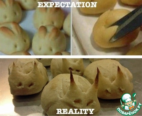 Посмеялась от души! Я буквально на днях сохранила из инета фоты по приготовлению этих заек. Теперь даже пробовать не буду, с моими ручками именно такие монстрики и получатся!