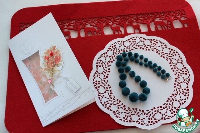 удивительной красоты красная салфетка с вырезанным орнаментом, салфетки для тортов, которые давнооо хочу и не разу не видела в наших магазинах (вот уж угодила), стильные бусы были тут же присвоены дочкой, Лариса, ты попала в яблочко, они ей тааак подошли и очень нежная, необыкновенная открытка с теплыми, душевными словами, которые меня растрогали