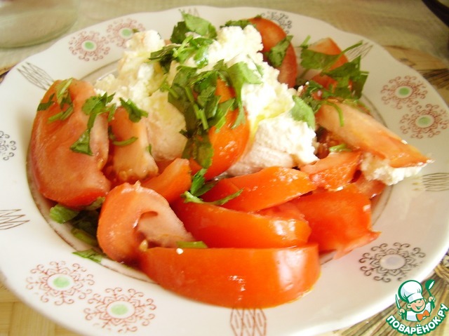 https://www.povarenok.ru/recipes/show/27696/, но я не очень люблю лук, поэтому делаю самый простой вариант: помидоры, творог, кинза и подсолнечное масло с запахом семечек. Соли совсем чуть-чуть. Ну и помидоры режу не мелким кубиком, а крупными дольками.