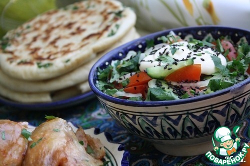 Салат из свежих овощей с кунжутом и сметаной и лепешки чалпак: