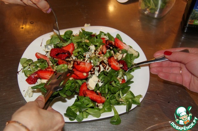 А салаты супер простые для Клубничного берешь салат корн, клубнику на 4 части режешь, сыр с плесенью куюиками, кедровые орехи и поливаешь бальзамическим кремом и оливковым маслом.