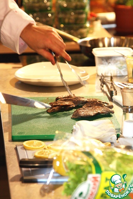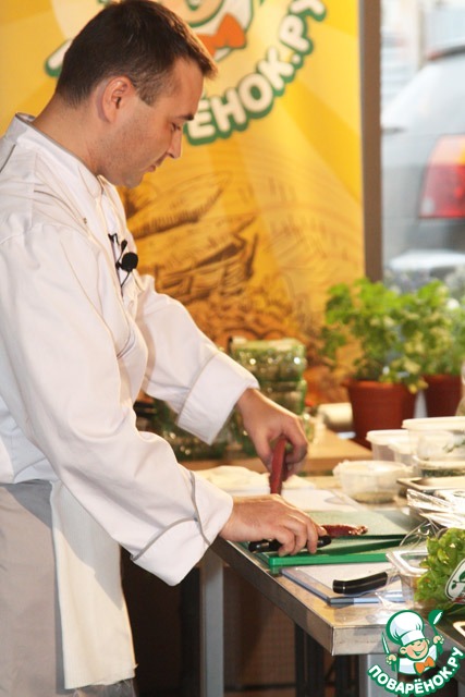 Официальная часть началась с выступления организаторов и мастер - класса от бренд-шефа сети "Кулинариум", который готовил телятину с соусом из тунца и утиную грудку с персиками и вишневым соусом